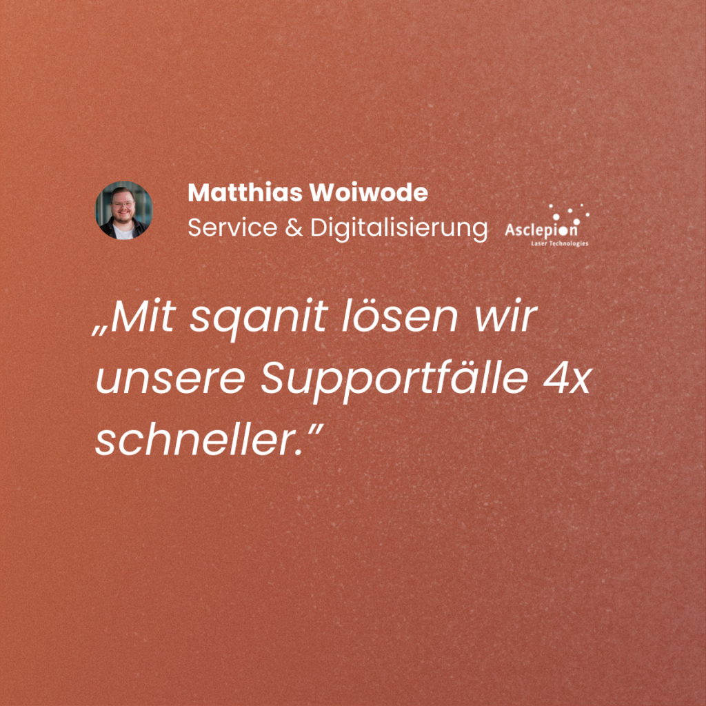 Highlights auf einen Blick • 4x schnellere Falllösung• Tickets in Ø41 Minuten geschlossen• Time to Value innerhalb weniger Wochen Erfahren Sie, wie sqanit auch Ihren Service digital stärkt: Kontakt aufnehmen. Über Asclepion Laser Technologies Asclepion gehört zu den weltweit führenden Herstellern medizinischer Lasersysteme für die ästhetische Medizin und Chirurgie. Geräte wie NanoStar, AlexStar, Dermablate […]